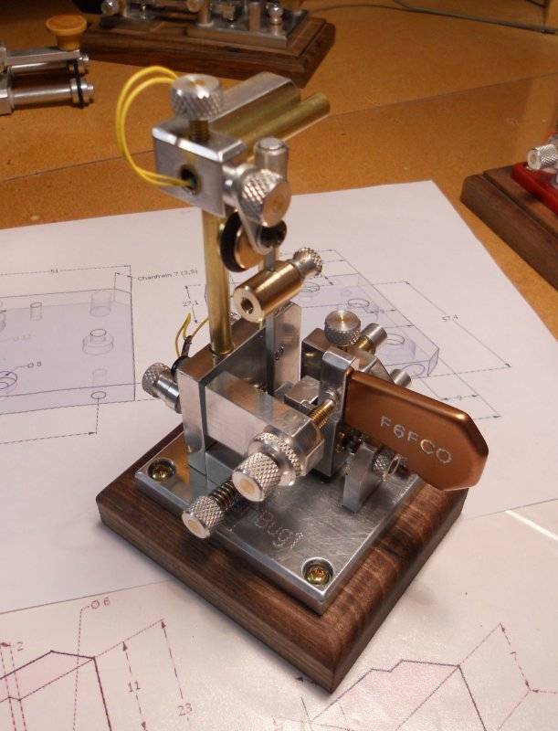 Encore une nouvelle création de F6FCO, qui construit de magnifiques bugs, que dire: admirer le résultat et le voir en situation de trafic... "Bug raccourci, entièrement sur pivots à billes, lame souple, alu6060, tension magnétique des bras, contacts argent, socle noyer...