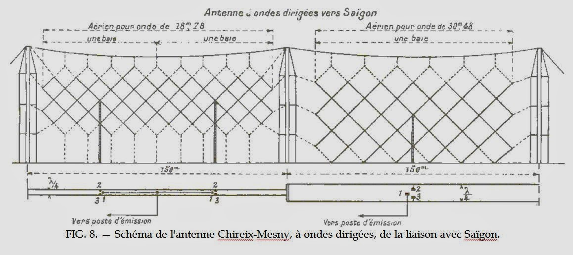Le poste à quartz, actuellement monté au bâtiment n° 2, est destiné à assurer les communications avec l'Indochine (Saïgon et Hanoï) en télégraphie et, éventuellement, en téléphonie, sur les deux longueurs d'onde de 18m 75 et 30m 48. En raison de l'importance de cette liaison, il était particulièrement indiqué de mettre en jeu sans délai des dispositifs d'antennes à ondes dirigées dont voici la description succincte.